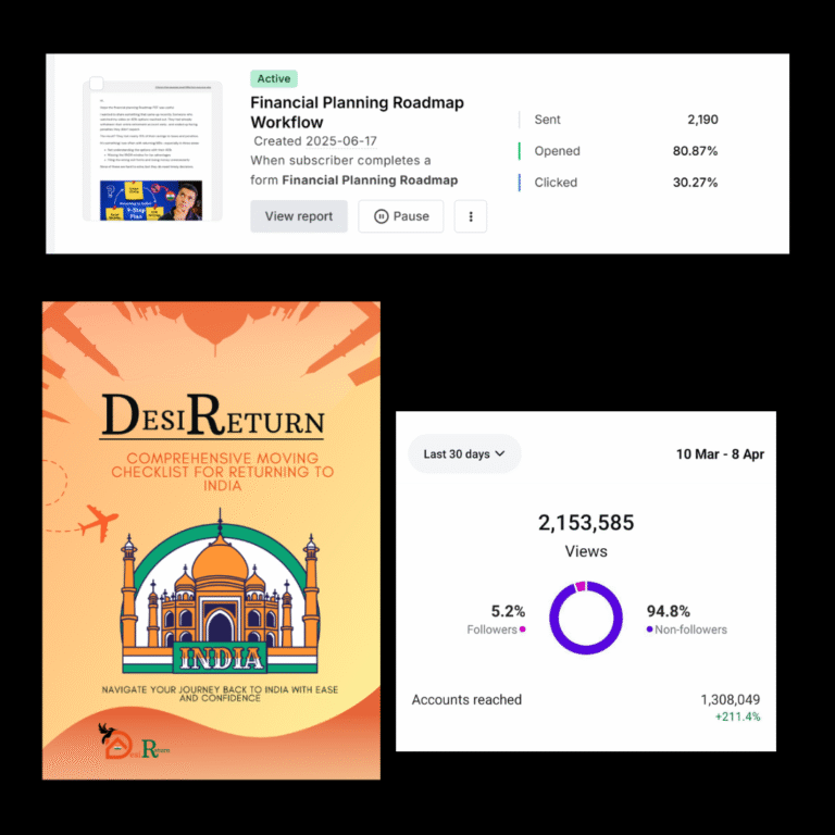 Grew social media following to 20k+, built lead magnets and email workflows, and contributed to digital products and tools including a Purchasing Power Parity calculator and an RNOR tax status calculator.