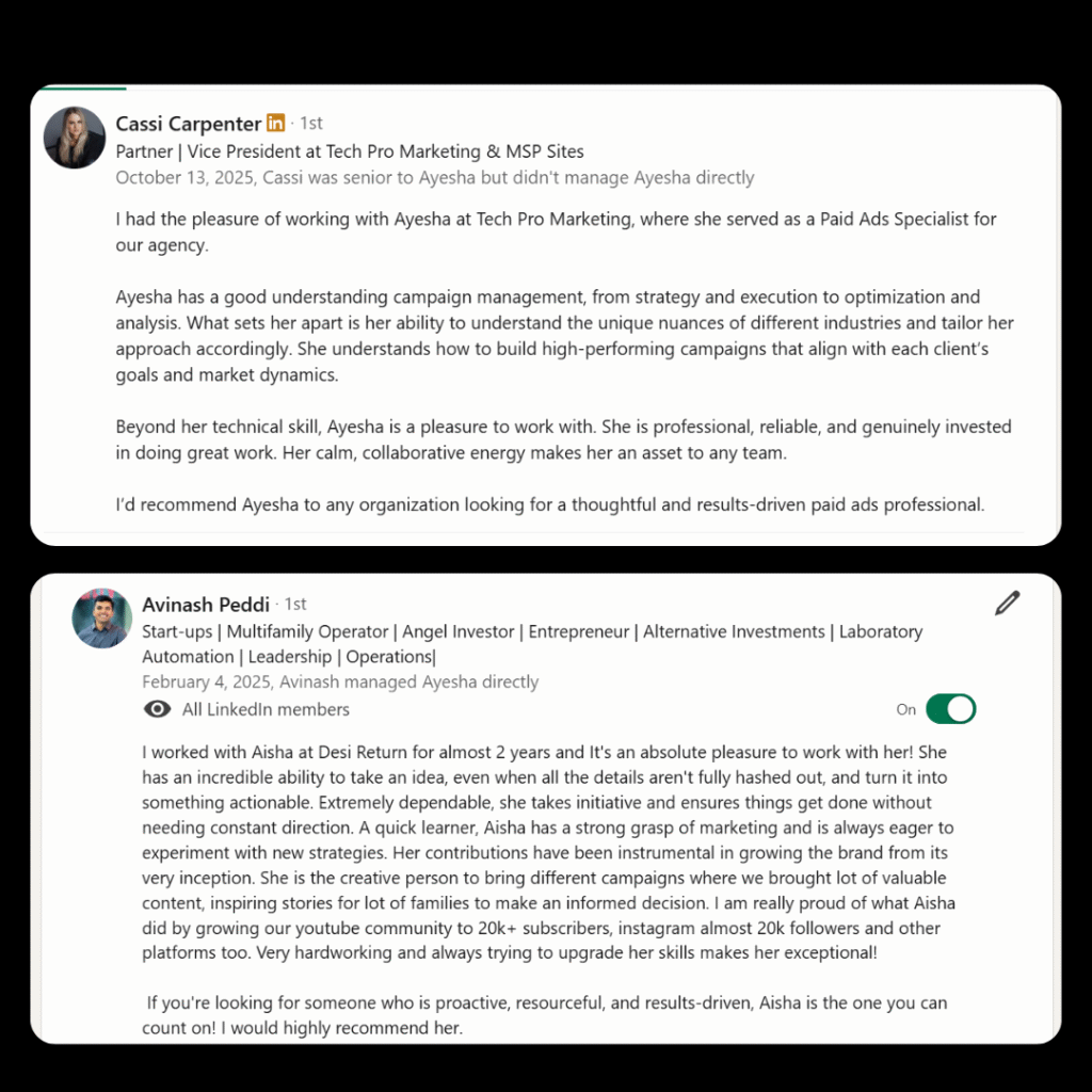 I’m Ayesha Tariq, a performance-driven growth marketer specializing in paid media and SEM, with a strong problem-solving mindset and a creative, data-led approach to experimentation and scaling.